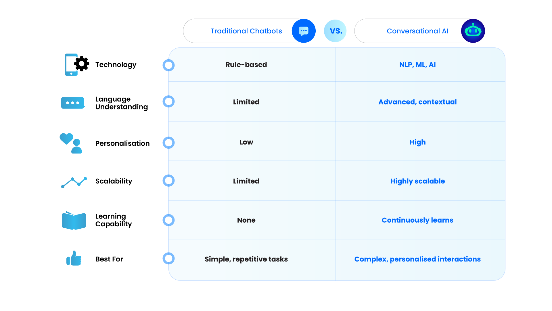 A traditional chatbot might be enough if you’re just starting and need a basic assistant. But if your goals include scaling support, improving engagement, and providing hyper-personalised experiences, investing in Conversational AI is a strategic move.