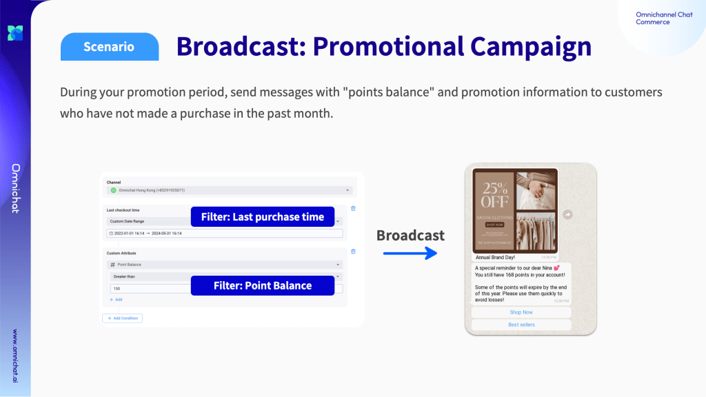 Scenario 2. Reviving dormant customers:Broadcast WhatsApp messages containing information about ‘remaining points’ and ‘upcoming events’ to customers who have been inactive for an extended period.