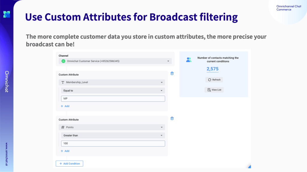 Have you ever used tags to segment your audience for WhatsApp Broadcasts? By leveraging custom attributes, you can further refine audience filtering conditions, like membership level, membership points, and preferred products. Improve conversion rates and reduce broadcast costs by targeting the right audience accurately!