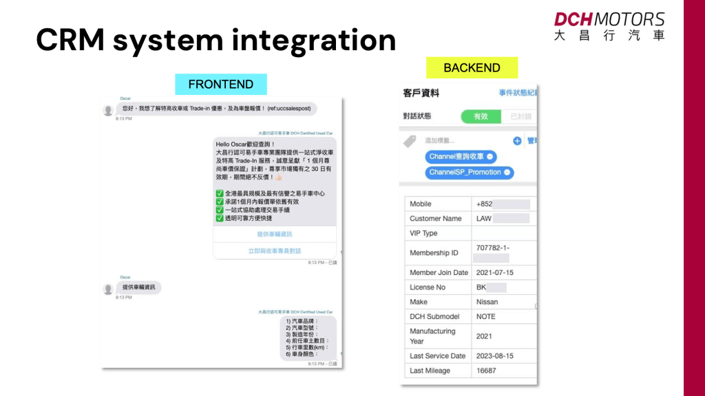 Seamlessly integrating Omnichat with their CRM system, DCH Motors can access customer membership information in Omnichat’s backend, such as owned car models, licence plate numbers, membership levels, and last purchase dates. Therefore, they can engage with customers through meaningful conversations and create more personalised experiences.