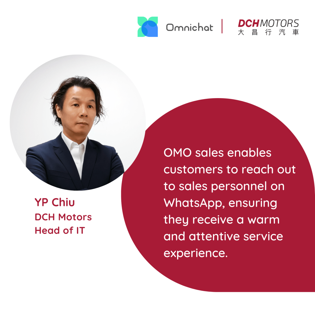 Omnichat’s OMO (Online-Merge-Offline) omnichannel sales solution breaks the boundaries between online and offline, driving business growth for DCH Motors. When a customer makes enquiries about automotive services via WhatsApp, the system automatically binds the customer to a salesperson who initially gathers an understanding of their car preferences through the Chatbot. Later, the salesperson provides personalised recommendations tailored to the customer’s specific requirements. YP Chiu, Head of IT of DCH Motors, stated, ‘Omnichat’s OMO sales solution allows customers to reach out to sales personnel on WhatsApp anytime, anywhere, ensuring they receive a warm and attentive service experience.’