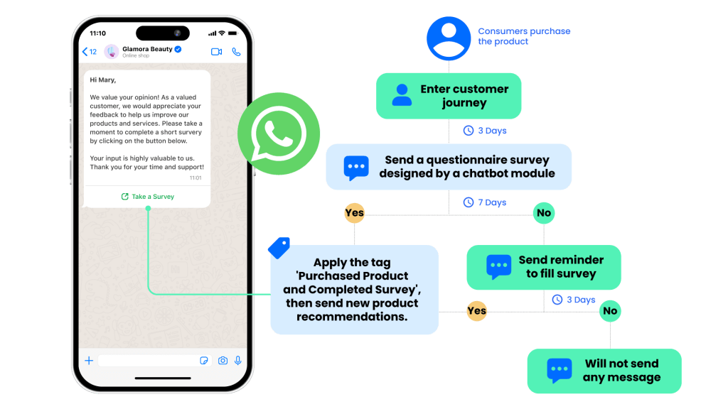 The journey doesn’t end at checkout. Omnichat enables retailers to keep conversations going through automated post-purchase journeys. From review requests and replenishment reminders to tailored product suggestions, you can maintain engagement and drive recurring sales — all directly inside chat.