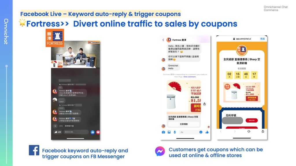 FORTRESS also conducted a Facebook live to grow the audience and business, and increase engagement and conversion rates. By pre-setting certain keywords for automatic reply, viewers could receive coupons (with discount codes) immediately via Facebook Messenger when leaving the comments with the keywords.