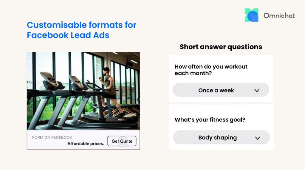 Facebook Lead Ads offer a variety of form options, adaptable for subscriptions, event registrations, trial requests, and more. Beyond basic customer information form, simple questions can be added to gain a better understanding of customer needs. For example, a gym could ask about workout frequency and goals, allowing for tailored services and attracting more potential members.