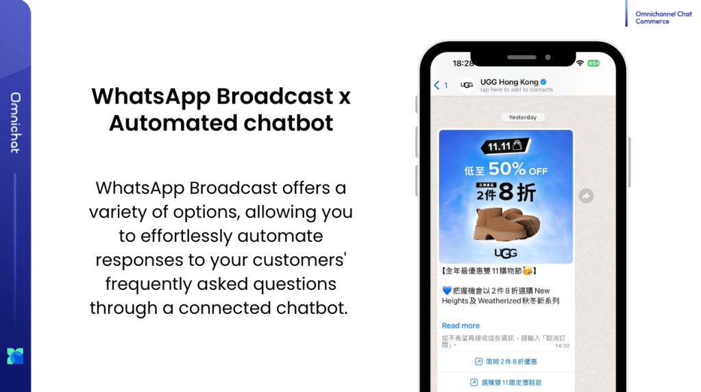 Leverage WhatsApp to tag customer preferences and needs gathered from Facebook Lead Ads forms for effective segmented management. With Omnichat’s Broadcast via WhatsApp, businesses can send personalised product updates and exclusive offers based on each customer’s purchasing intent, gradually guiding them from Facebook enquiries to completed purchases.