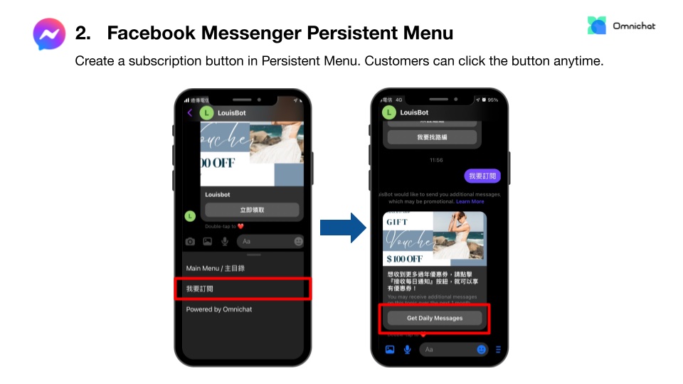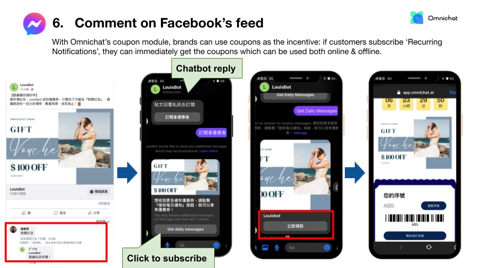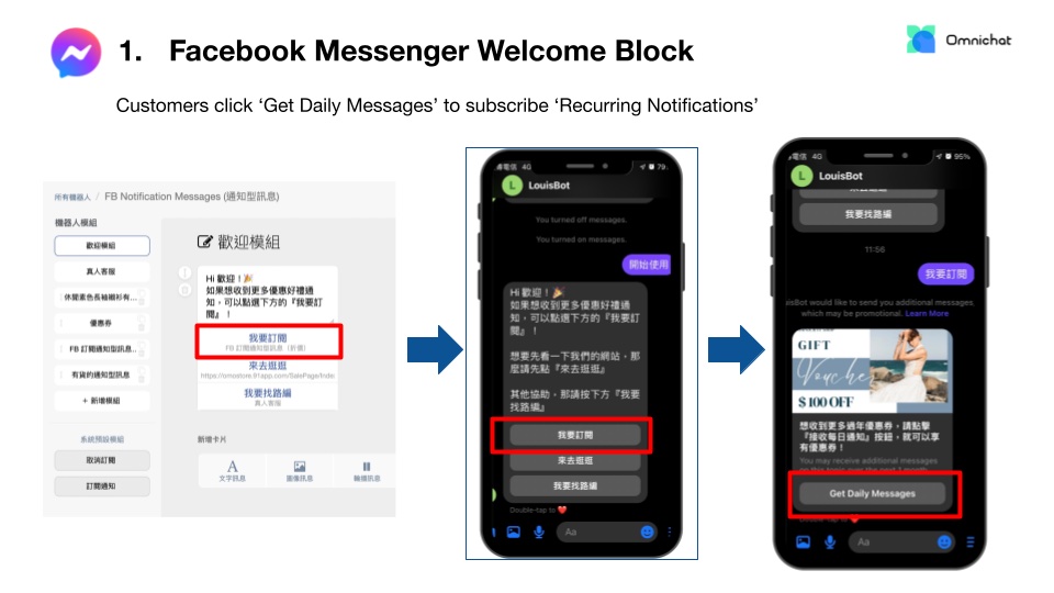 Partnering with Omnichat, Facebook allows businesses to send ‘Recurring Notifications’ to customers upon active subscription. (You may fill in this form if you would like to apply.) But it does not mean brands can broadcast messages to customers all the time, this is how it works: