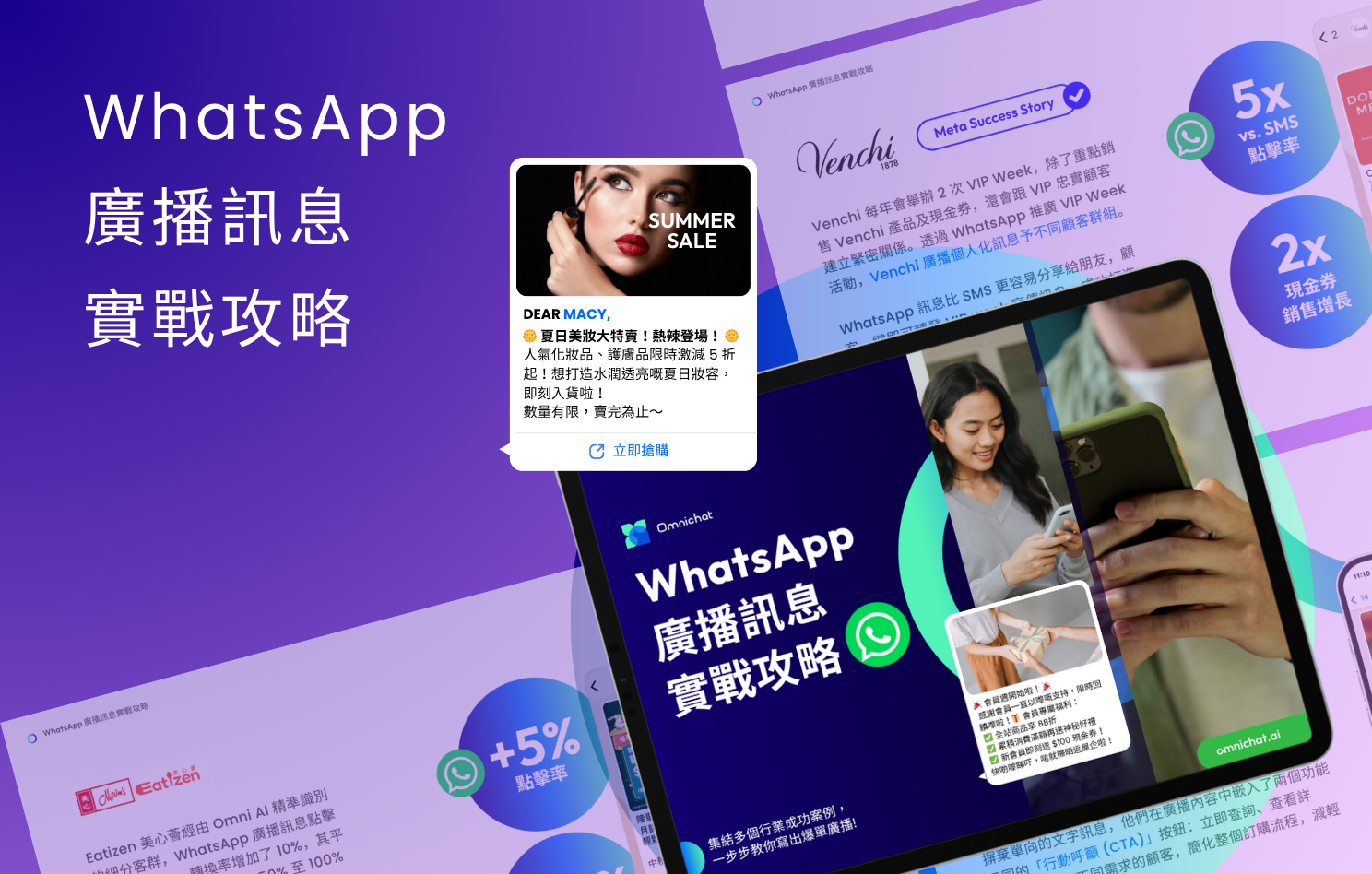 WhatsApp Broadcast 需要先向 Meta 官方申請「Message Template」(訊息範本),通過審核後就可以在廣播訊息時選取使用。透過 Omnichat 開通 WhatsApp Business API 的用戶,可以直接在 Omnichat 後台申請 Message Template! 本文重點:WhatsApp Message Template 訊息範本・訊息範本:企業主動開啟 WhatsApp 對話的必備工具,支援圖文並茂,有助於降低封鎖率並提升專業感。・四大結構:標題、內文、頁尾、