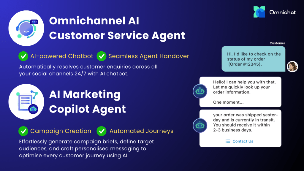 - AI 客戶服務助理:Omnichat 等平台利用 AI 助理,通過 WhatsApp 和其他常用通訊渠道無縫處理顧客查詢、處理訂單和管理退貨。全天候 24/7 運作,提高了回應速度,並釋放人手處理更複雜問題。