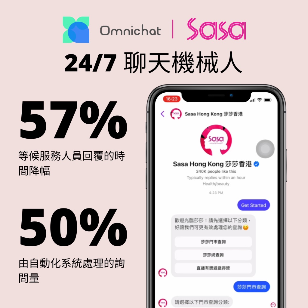 美粧產品零售集團莎莎整合多個通訊渠道後,顧客等候服務人員回覆的時間錄得 57% 降幅,50% 的顧客查詢可以由自動化系統處理。
