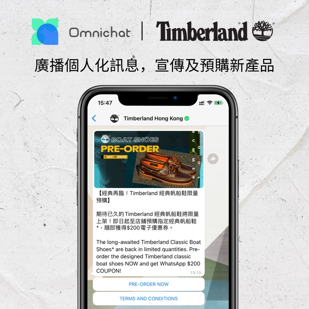 全球首屈一指的休閒戶外服裝鞋履品牌 Timberland 就使用 WhatsApp 廣播新產品預購訊息予目標客群,顯著提升了銷售轉化。