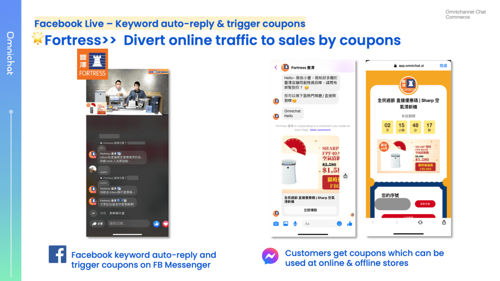 豐澤也在 Facebook 直播使用 Omnichat 的關鍵字自動回覆、優惠券功能,觀眾留言關鍵字即獲優惠券(附有限定優惠碼),有效提高互動率、轉換率。