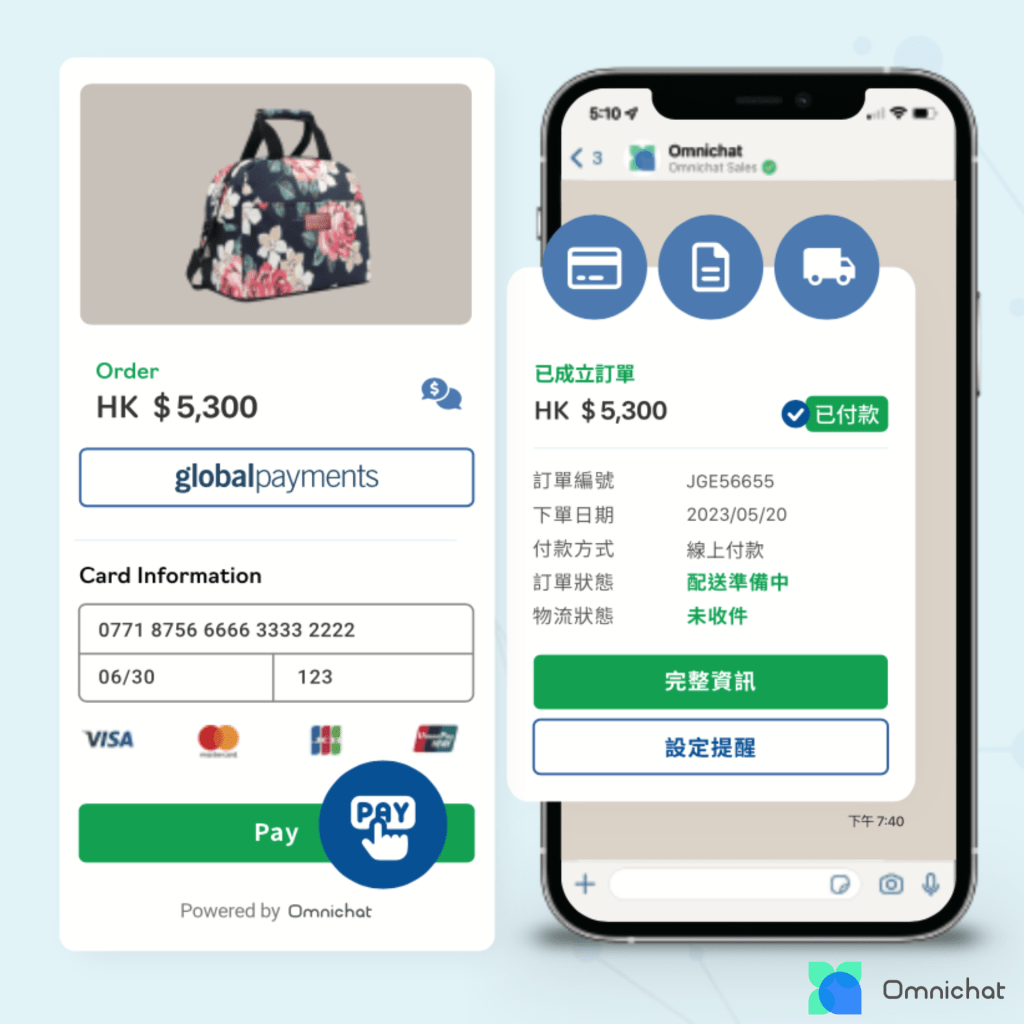 ・無縫結帳:Omnichat 支援在 Facebook、Instagram 及 WhatsApp 中直接傳送付款連結 (Payment Link),以最快速度完成每一筆交易。