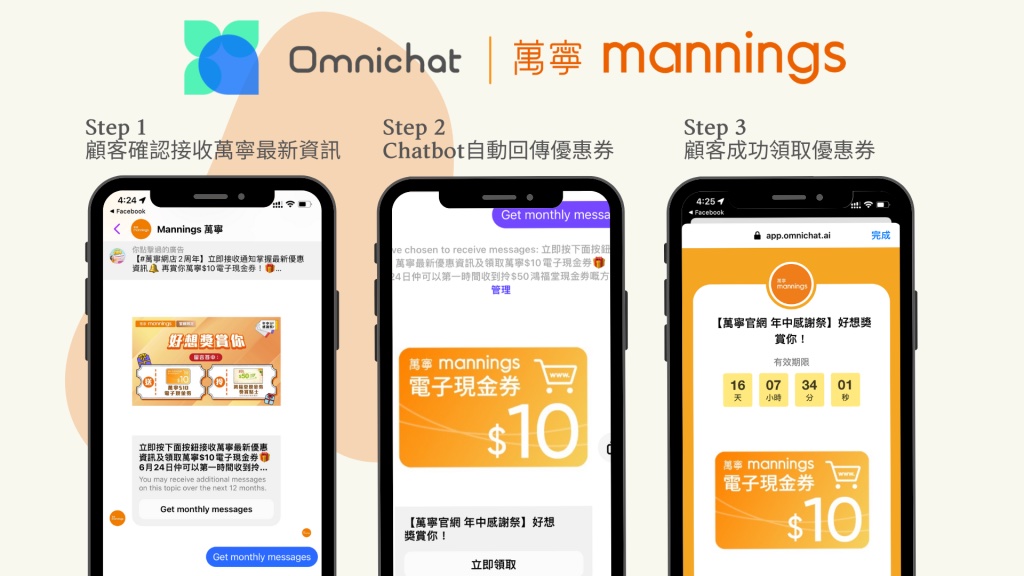 許多品牌紛紛使用 Facebook 新推出的定期通知(Recurring Notifications),用作發送大量廣播訊息,不但能留存一班潛在顧客,亦能有利日後行銷推廣。顧客選擇訂閱即可定期接收商家訊息,訂閱期為 6 / 9 / 12 個月,視乎廣播訊息用途而定,最重要的是,商家廣播訊息的費用全免,而使用 Facebook 廣播比一般 SMS、EDM 的開啟訊息率高達 70% 以上。因此,不少品牌以優惠券吸引顧客訂閱,之後便可向顧客傳送個人化的自動訊息,如促銷訊息、新產品資訊,加強用戶互動或加速提升銷售業績。
