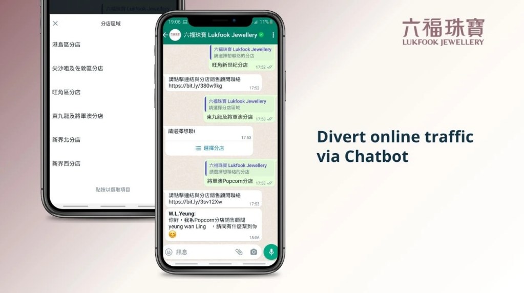 訪客進入六福 WhatsApp 後,點擊聊天機械人提供的選項,Chatbot 會將訪客自動分流至客人所選擇的六福分店,由該分店的珠寶顧問提供一對一的專業跟進。