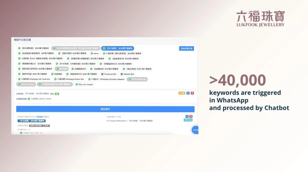 六福設定了關鍵字自動回覆功能,處理大量常見的查詢,例如:「優惠券何時到期?」、「如何使用?」及「產品有何特點?」等。截至 2024 年,此功能觸發了超過 4 萬次,讓六福的人手能專注處理更複雜、更具價值的問題。