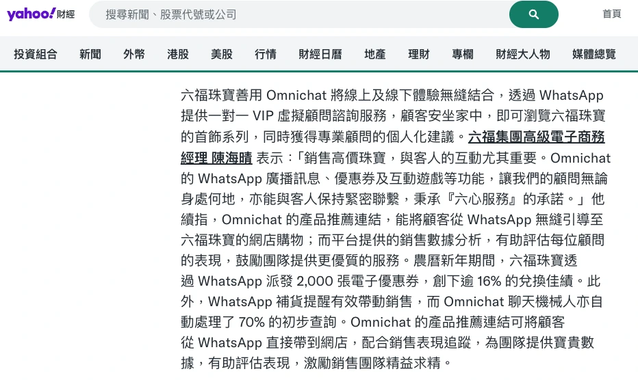 六福珠寶曾於兔年透過 Omnichat 於 WhatsApp 推出新春限定求籤遊戲,完成遊戲後更送出 9 折電子優惠券及電子揮春,吸引用戶購買吉祥的黃金飾物,成功將線上顧客帶到線下門市,提高銷售。