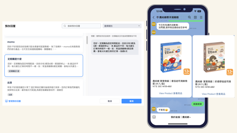 為此,農純鄉團隊善用 Omnichat 的客服整合系統,運用系統中的「預存回覆」設定各項常見問題的回覆,由系統協助團隊快速一鍵回覆重複問題,讓客服更有效率且能夠保證商品諮詢的服務質素。