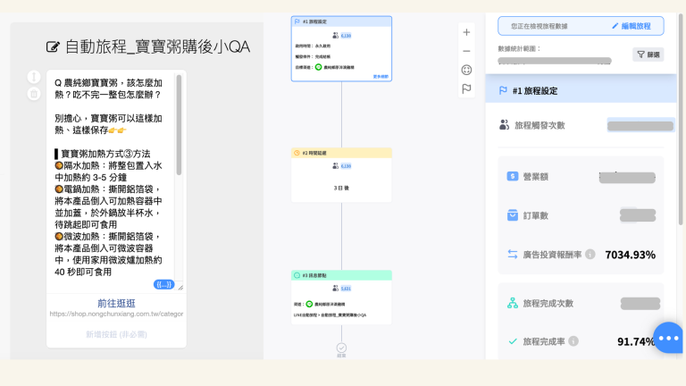 以寶寶粥商品為例,農純鄉針對已購買寶寶粥的顧客,在訂單完成三日後,主動發送訊息解釋保存方法及常見問題,減輕新手媽媽對產品使用的焦慮,讓她們更放心地給寶寶補充營養。此外,系統會在產品使用週期接近結束時,自動鎖定可能需要續購的顧客進行廣播,在精準的營銷策略下,創下了 ROAS 超過 70 的成效。