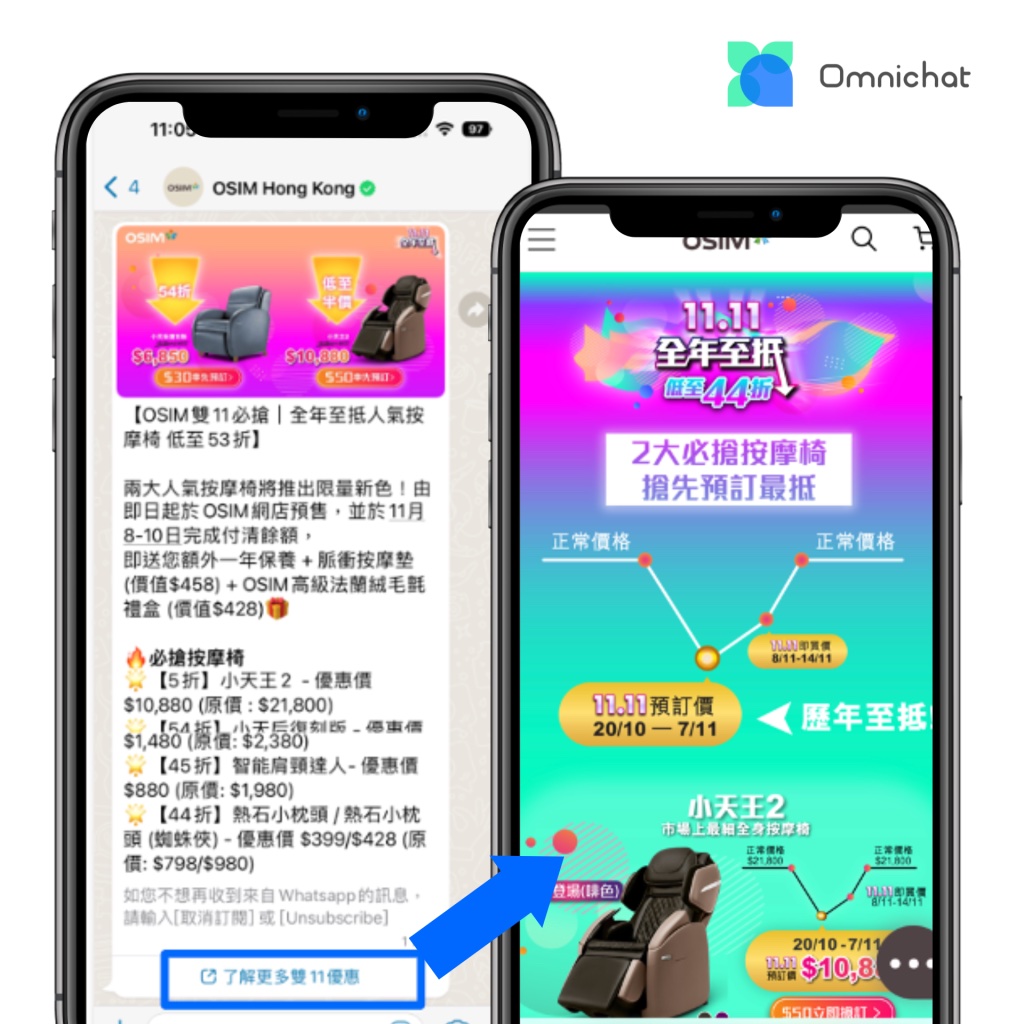每年 11.11 購物節都是各大零售商的兵家必爭之地,OSIM 運用 Omnichat 功能,於過去的雙11發送 WhatsApp 廣播訊息、網站營銷訊息,吸引顧客前往官網下單或預訂按摩椅,成功促成 30% 轉化率!