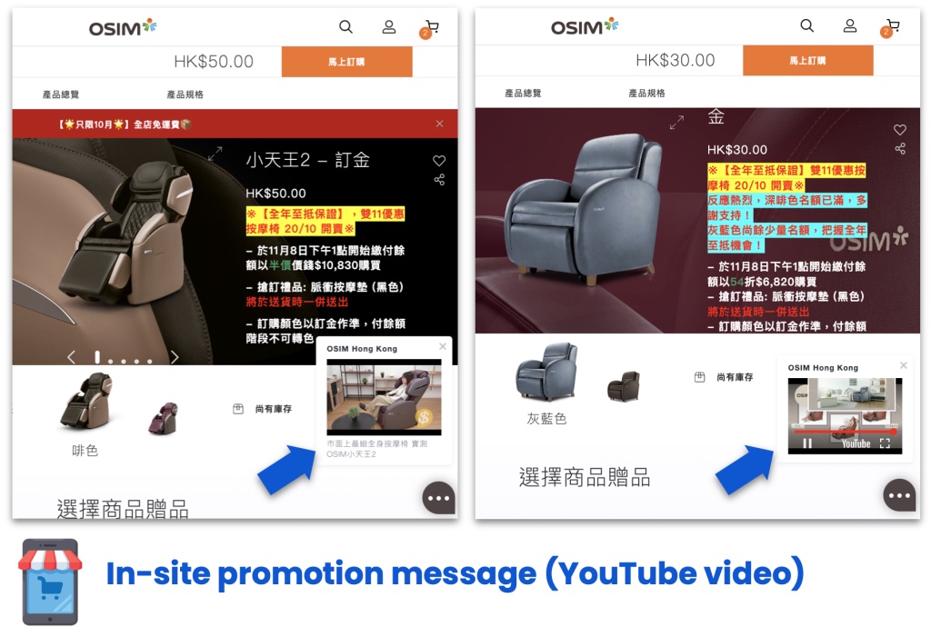 透過 Omnichat 網站插件,OSIM 於官網設置網站營銷訊息,顧客瀏覽指定頁面或停留指定時間,就會觸發訊息。OSIM 於雙11推廣活動期間,設置網站顯示 YouTube 影片訊息,吸引顧客購買指定按摩椅,推動銷售。
