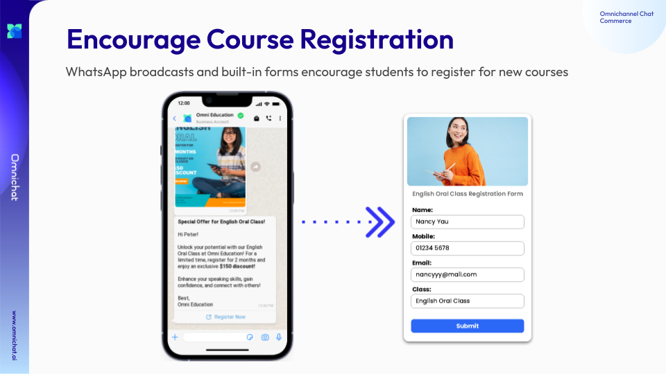 Omnichat 作為全球領先的對話商務解決方案供應商,提供一個強大的平台,無縫整合 WhatsApp、Instagram、Facebook、LINE、WeChat 和您的官方網站 Live Chat。憑藉即時、雙向的自動化功能,Omnichat 為教育行業的數碼轉型開啟了全新的機遇。借助 Omnichat,教育機構能夠高效管理顧客數據,提升整體服務質素,始終走在行業最前端!