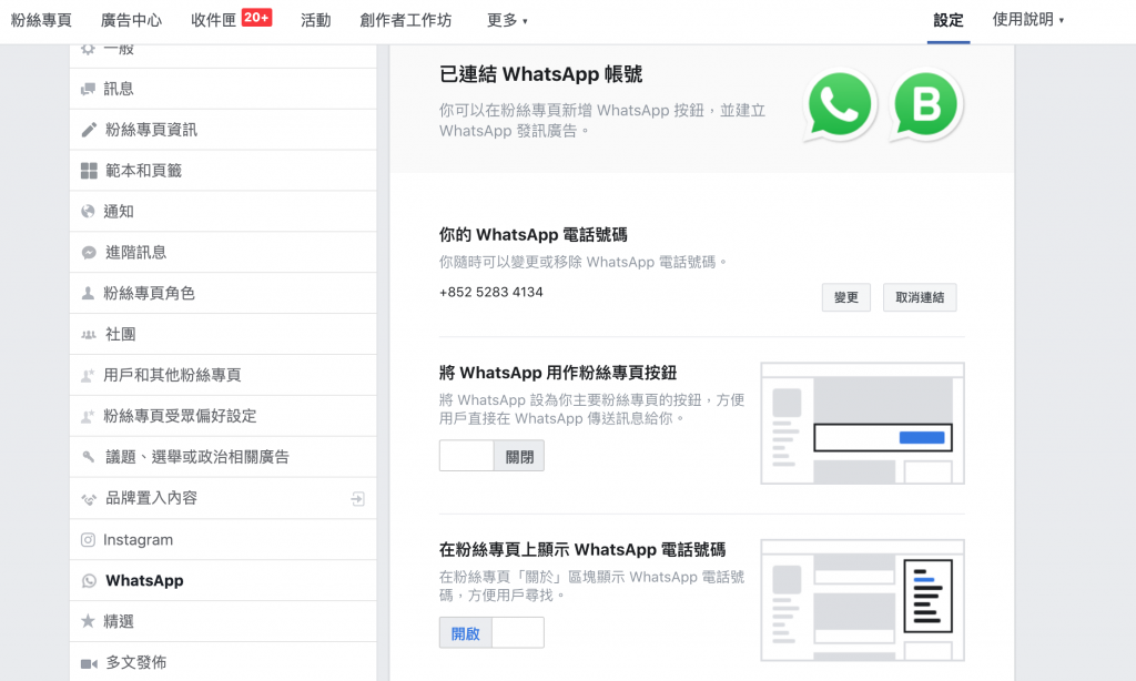 - 將 WhatsApp 用作粉絲專頁按鈕:視需求決定是否要開。