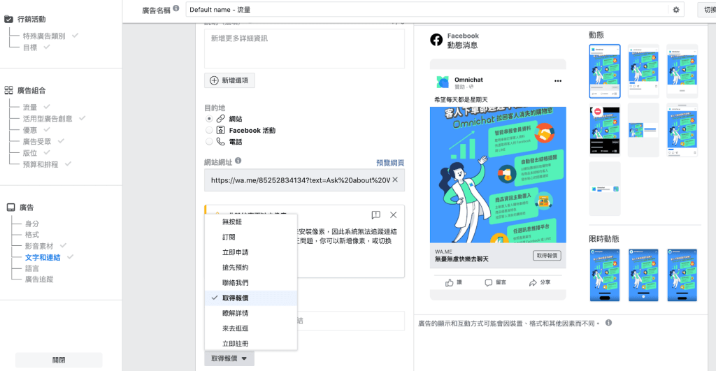 除了在廣告的內建選項中,選擇vWhatsApp 以外,還有另外一個方法就是「用連結包裝」,直接把加入 WhatsApp 商業帳號的頁面當作 Landing Page。