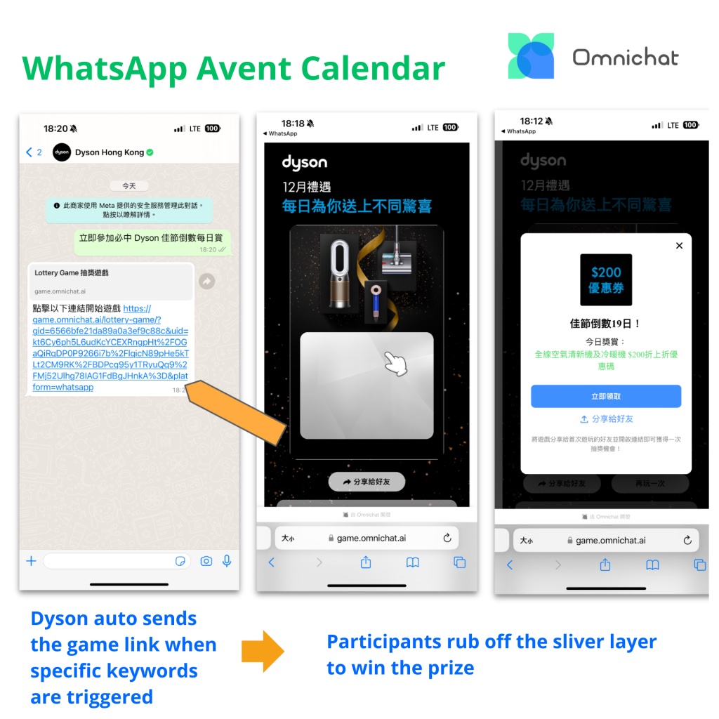 倒數月曆(Avent Calendar)近幾年十分流行,精品家電品牌 Dyson 使用 Omnichat 遊戲功能製作 WhatsApp 版本的倒數月曆,參加者可以於活動期間每日參與 5 次遊戲,領取 Dyson 精心準備的不同驚喜!