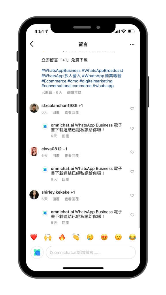 - Build remarketing lists: Publish recruitment posts of WhatsApp subscribers on IG, and private messages with WhatsApp account link will be automatically sent once customers leave comments