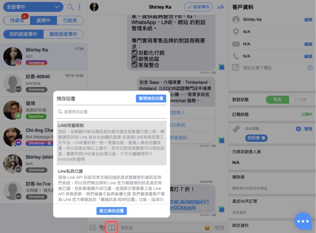 Save the frequently used responses of customer service team in ‘Saved Replies‘. The team can just click the book icon next to the input box to select the saved reply and send it out promptly in the conversation.