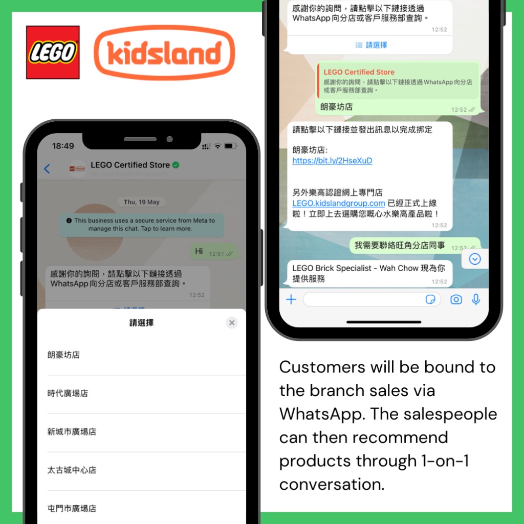 Omnichat assisted Kidsland in applying for WhatsApp Business API and obtaining Green Tick certification, which enhances the brand’s ‘professionalism’, ‘credibility’ and ‘customer satisfaction’, and increases customer confidence in purchasing online. After a customer sends a message to Kidsland, s/he will be bound to the branch sales. Sales can answer customers enquiries or recommend products to customers anytime, anywhere.