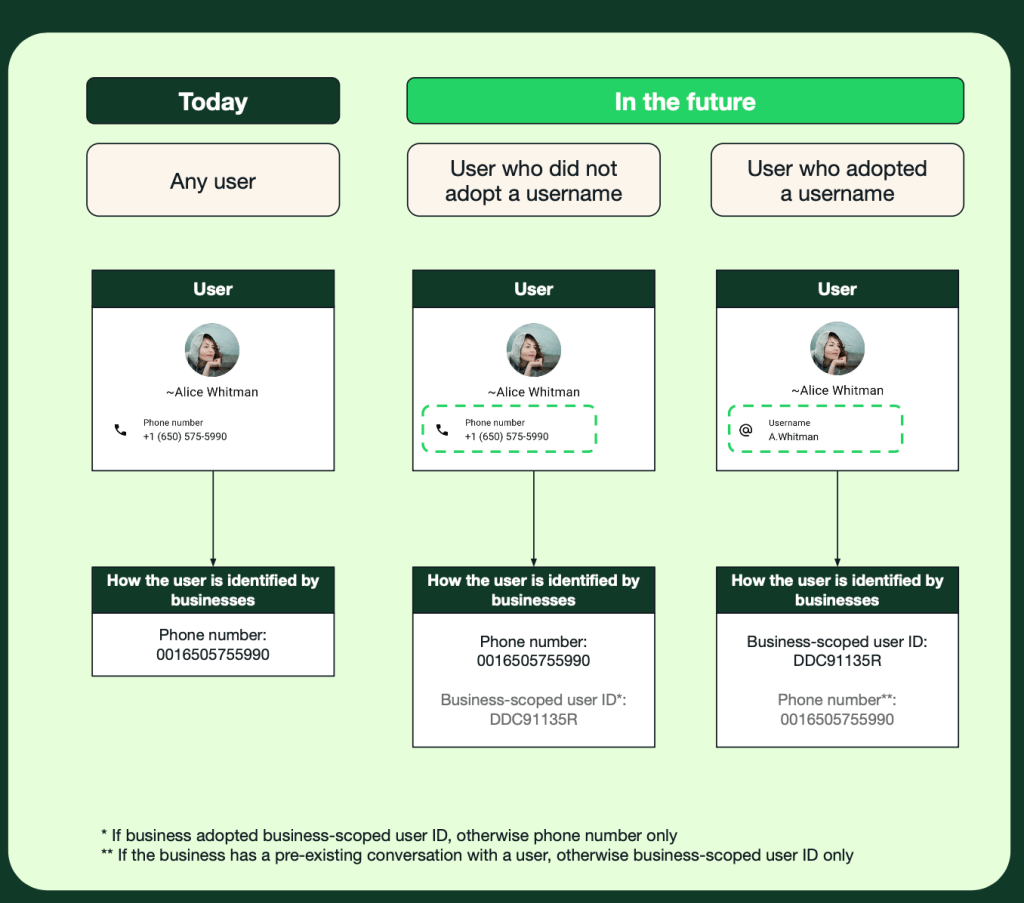 - New Identifier: Businesses must adopt the Business-Scoped User ID (BSUID) to identify and message users who opt for usernames.