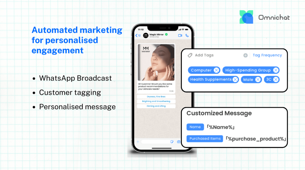 Additionally, businesses can leverage insights from customer behaviour—such as browsing time and interaction history—to make accurate product recommendations. For instance, customers can effortlessly click on the buttons within WhatsApp broadcasts to access detailed product information (e.g. suitability for skin type or ingredient transparency). Omnichat’s tagging feature further helps businesses segment customers according to their preferences, enabling salespersons to offer highly relevant product recommendations.