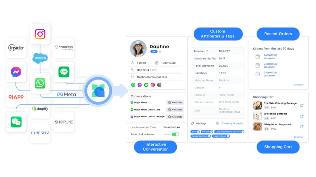 By integrating with the CRM system, Omnichat ensures that whether a customer is visiting a website for the first time, joining the membership, or making a repeat purchase, all interactions, behavioural insights, and tagged data are consolidated into a single profile, providing seamless data synchronisation across all channels. This allows businesses to deliver contextual, highly personalised messaging at every stage of the customer journey, maximising engagement and conversion rates.