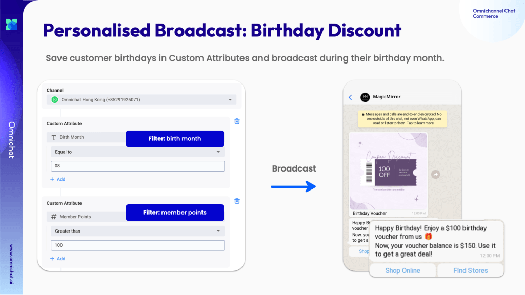 Synchronised member data can be incorporated into broadcast messages for personalisation; for instance, birthday discounts can be sent to customers during their birthday month to foster loyalty and encourage conversions.