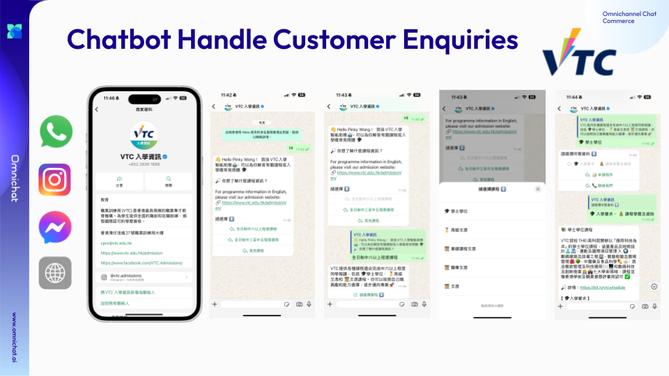 The Vocational Training Council (VTC), a leading professional education institution in Hong Kong, leverages Omnichat’s chatbot to guide parents in accessing enrolment information through the intuitive menu-based interface, including course categories, application procedures, and admission details. WhatsApp then seamlessly directs conversations to the appropriate staff for personalised, one-on-one support, significantly enhancing customer satisfaction.