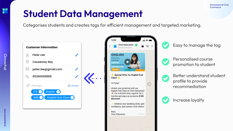 Through API integration, behavioural data collected by Omnchat and personal information submitted by students and parents, Omnichat’s backend automatically syncs details such as enrolment dates, payment amounts, and student names across platforms. This creates a comprehensive customer profile for each student, enabling institutions to better understand their preferences.