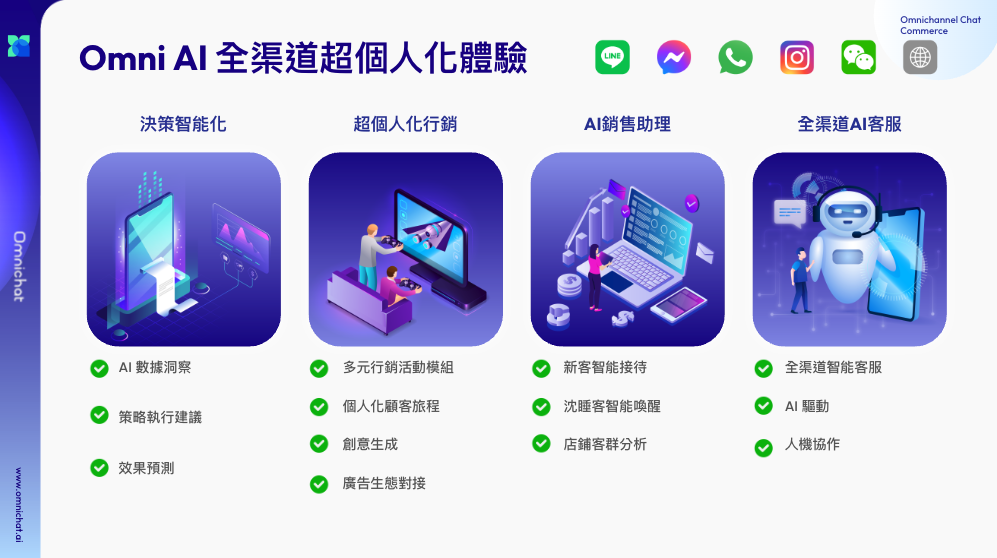 Omnichat 是全台唯一同時獲得 LINE、Meta、AWS 官方技術認證的 SaaS 平台,支援全台最多社群平台整合(LINE、Messenger、Instagram、WhatsApp、官網、門市通訊)。與其他工具不同,Omnichat 不只是訊息整合,更是完整的營運成效推進工具。