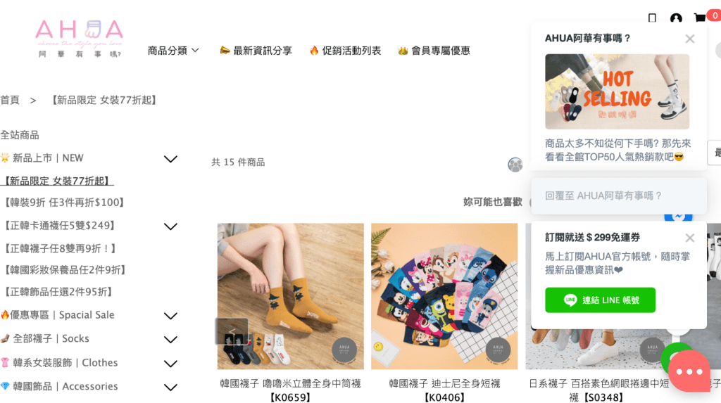當客人點進不同類別,例如到「新品專區」停留 10 秒鐘,就會看到右下角觸發「熱銷精選」的圖片。《阿華有事嗎》觀察到這個分類頁的客人多半還在找自己喜歡的款式,因此貼心設置讓客只要點圖片就進入熱銷商品頁面,增加客人逛下去的動力。