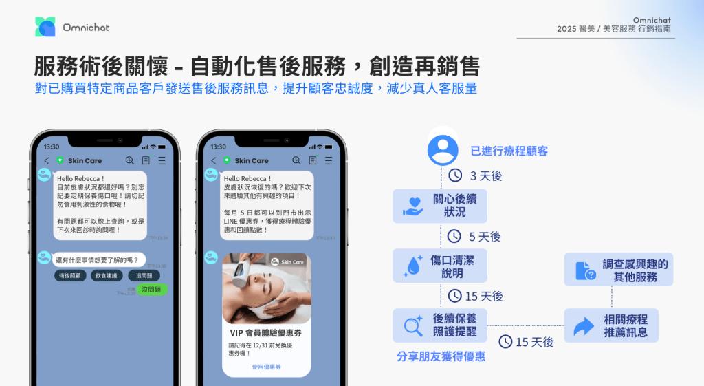 Omnichat 可透過行銷腳本的方式整合 LINE Chatbot,做到醫美診所所需要的預約、諮詢及術後關懷再行銷的效能。