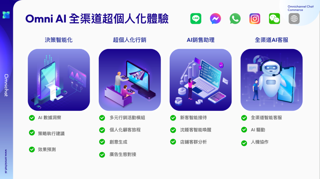 若你對於數位工具與 Chatbot 的認識較初期,或希望能夠有個全面性的工具來實現 AI 客服與銷售的整合需求,那麼建議你可直接導入 Omnichat 的 OmniAI Agent:將以單一整合平台,實現品牌在客服、內容、語言學習、商品推薦、服務預約、顧客關係管理 等 AI 作業需求,以提升品牌在數位行銷上的全方位效能。