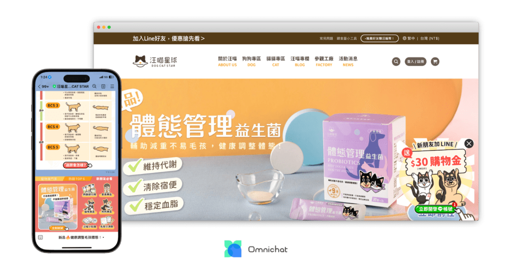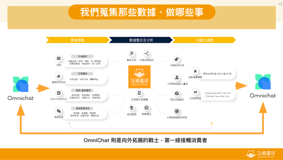 除了有專業獸醫師、營養師打造產品,汪喵星球的團隊也擅於用數據讓對的產品、在對的時機、被對的人看見,汪喵星球行銷主管 Kevin 表示:「汪喵星球透過 CDP 蒐集保留所有數據並作為決策核心,而 Omnichat 則是向外拓展的戰士,最直接地與消費者溝通互動。」