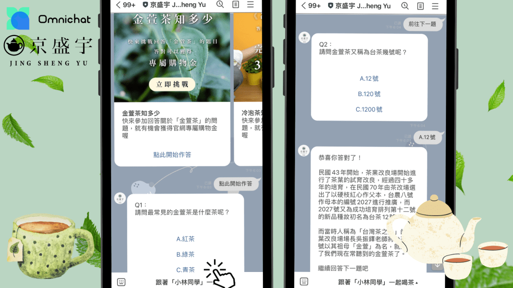 京盛宇也透過 Chatbot 做到自動行銷。例如團隊透過「關鍵字自動回覆」功能,觸發「金萱茶知多少」遊戲體驗,讓 LINE 官方帳號的客人一鍵開啟,互動過程讓客人更了解商品,也感受到京盛宇對茶品的愛與溫度。