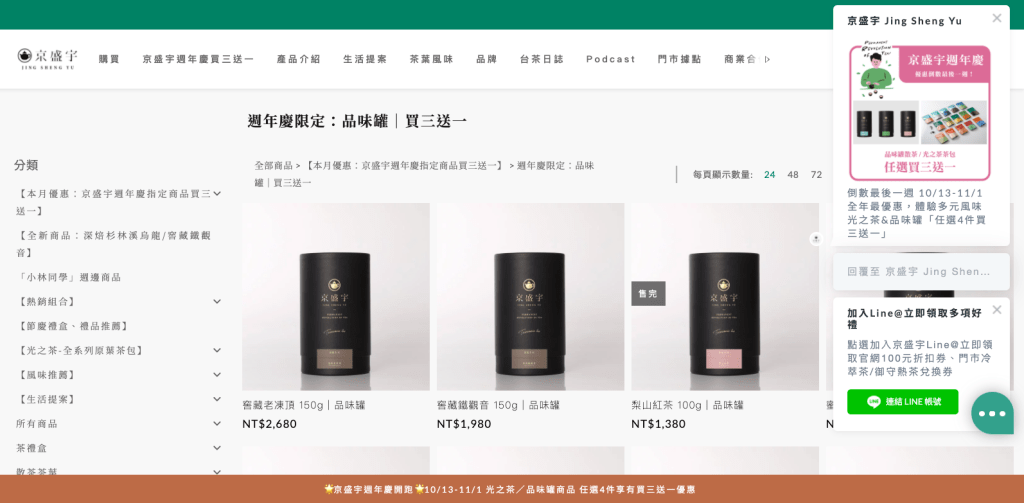 京盛宇透過 Omnichat 社群身份綁定功能,讓顧客進入官網就能在右下角看到加 LINE 拿 100 元優惠券的誘因,不管點幾哪個頁面都能看到這則小提醒。