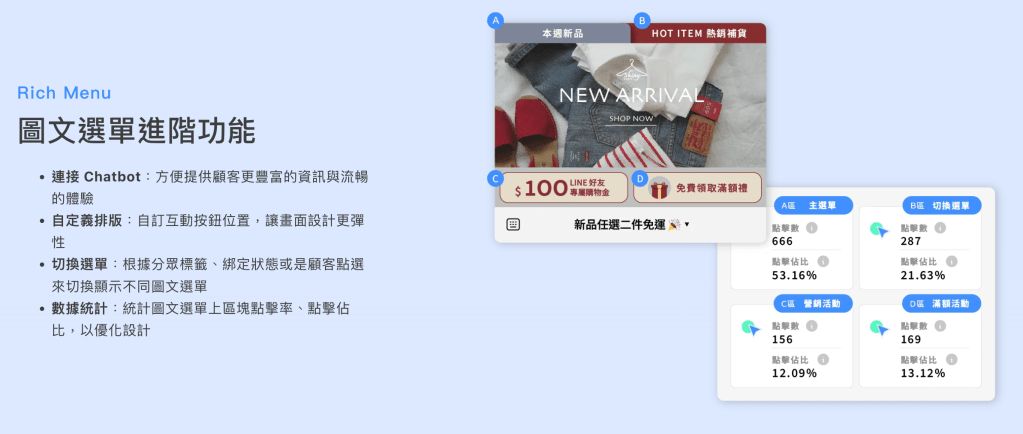 圖文選單是品牌展示「限時優惠」、「新品上市」或「當季主打」的最佳位置。相較於容易被淹沒的推播訊息,常駐在底部的圖文選單能持續曝光行銷活動,縮短顧客從看到產品到點擊下單的路徑,大幅提升導購效率。