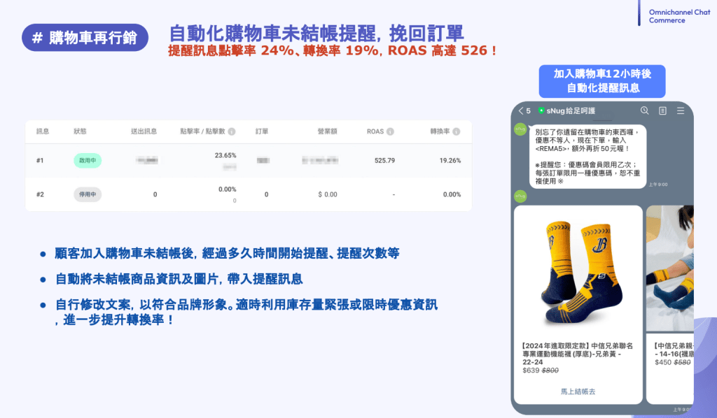 鎖定將商品加入購物車但未結帳顧客,發送 WhatsApp 或 LINE 購物車未結帳提醒,並在訊息中導入附有產品推薦