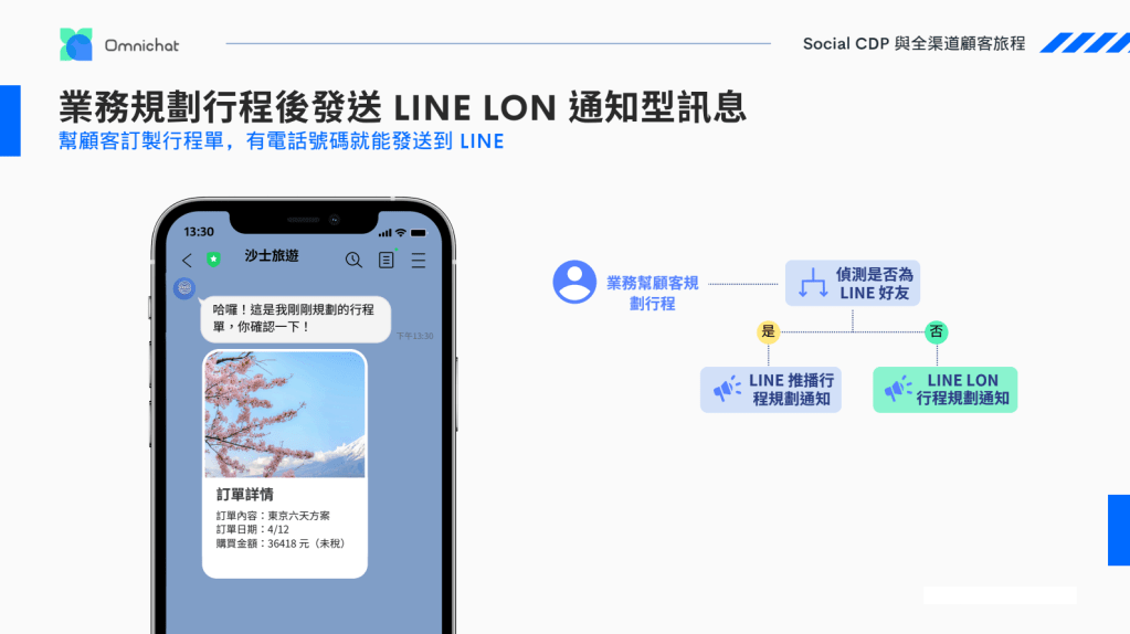 當業務完成訂單後,可透過 LINE 發送行程通知、訂單通知、出發提醒 等通知型訊息