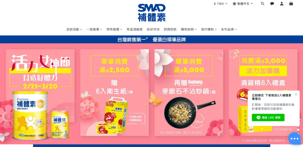 已經成立 40 年的營養保健品牌補體素,在台灣擁有超過 8000 間銷售通路,包含大型超市全聯、Costco 等。隨著國人對蛋白質攝取的知識提高,越來越多客人在官網上購買,補體素特別需要機器人客服整合系統,更希望有網站自動行銷工具,幫助線上業績。