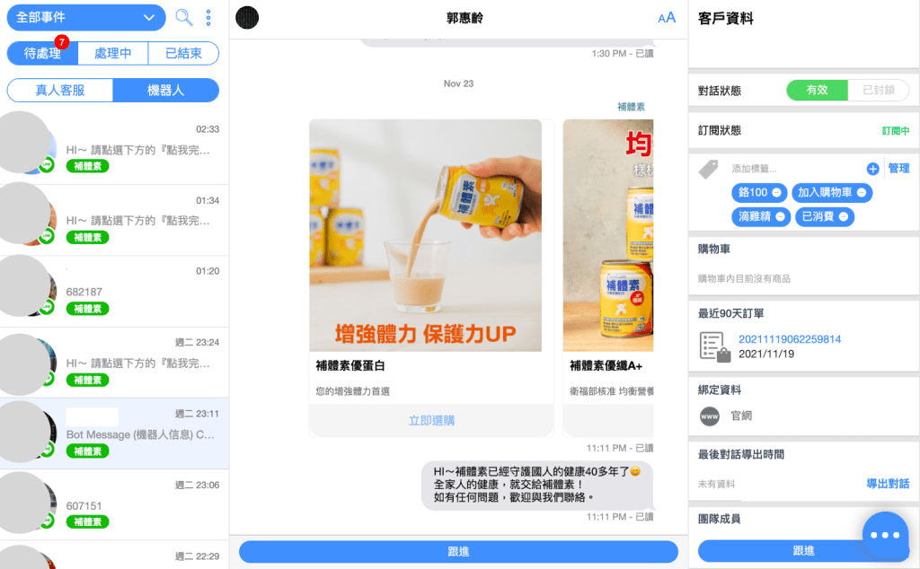 補體素同事即時記錄客服問題,並透過後台分類待處理、處理中、已結束等對話階段,讓同事很清楚知道哪些客人還在處理階段,不會點開對話框、忘記回覆就石沉大海。