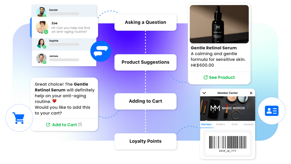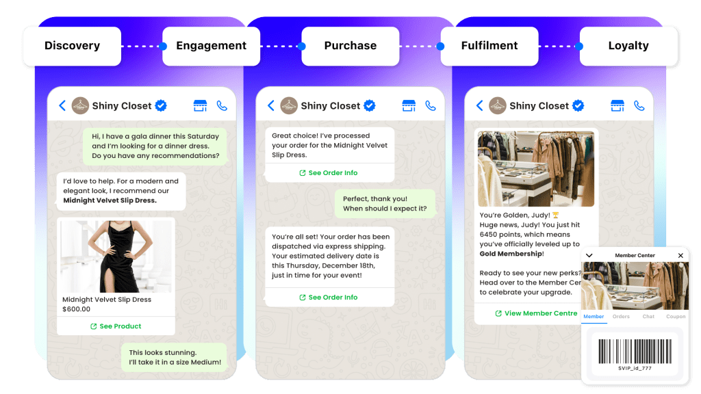 Even after the sale, WhatsApp continues to nurture the relationship through personalised loyalty touchpoints such as rewards reminders, VIP access, and reactivation journeys tailored to individual behaviour. Omnichat ties every stage together through automation, unified customer data, and integrated payment flows, ensuring each interaction feels timely, relevant, and consistently connected throughout the customer’s journey.